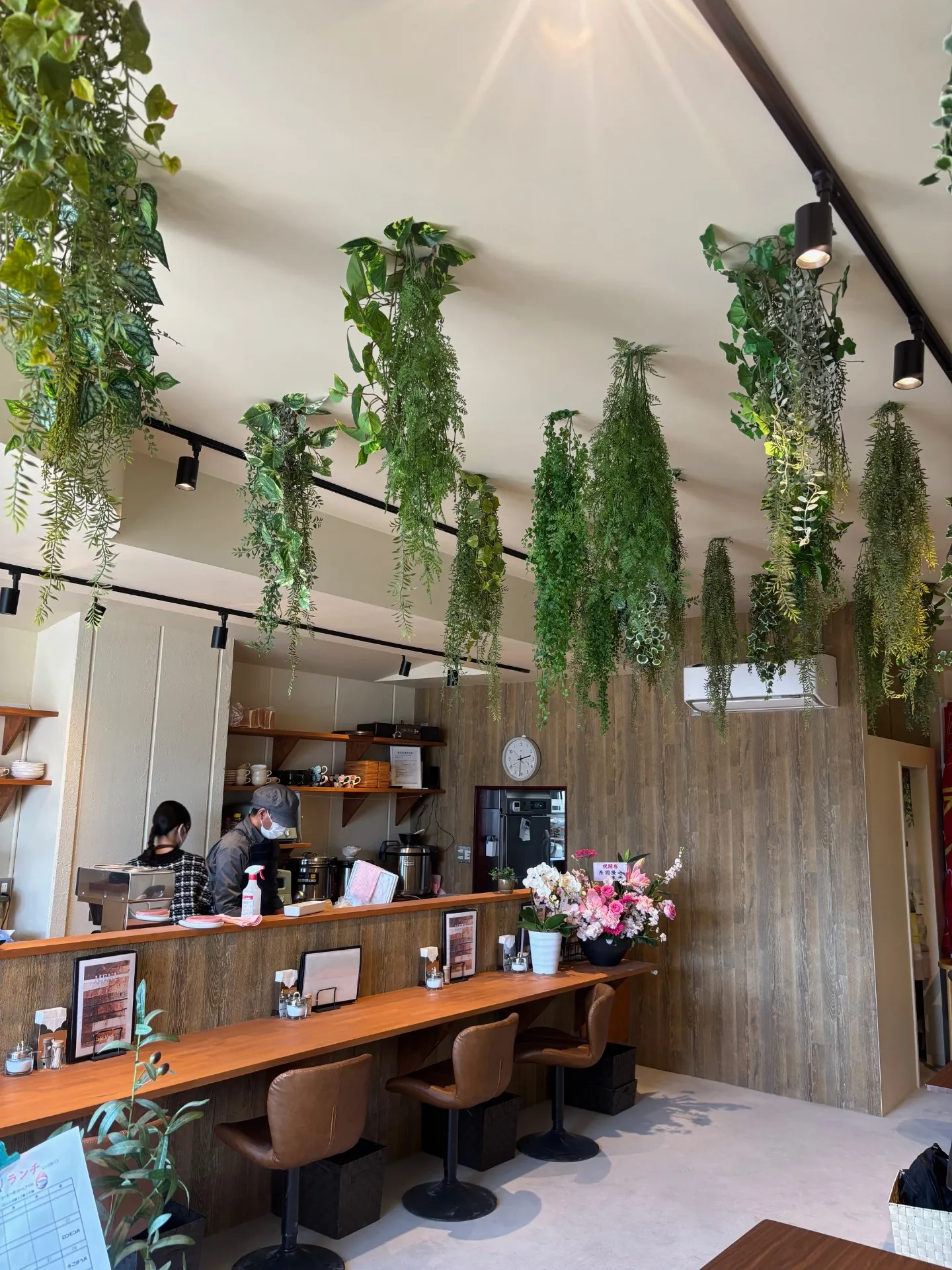 グリーンで癒すカフェ空間 2025/09/22 カフェ グリーンジャングル After よ~く見てもリアル! グリーンが単一にならないよう、豊富な種類、組み合わせに。 After 陽に差し込む リラックス感、増し増し Before 工事中 これから天井塗装 カフェ グリーンジャングル After オーナー様と お客様にもご好評だそう♬ After ウッド調とも相性よし👍 木目とグリーンはやはり相性抜群! Before 工事中 WORKS 事例